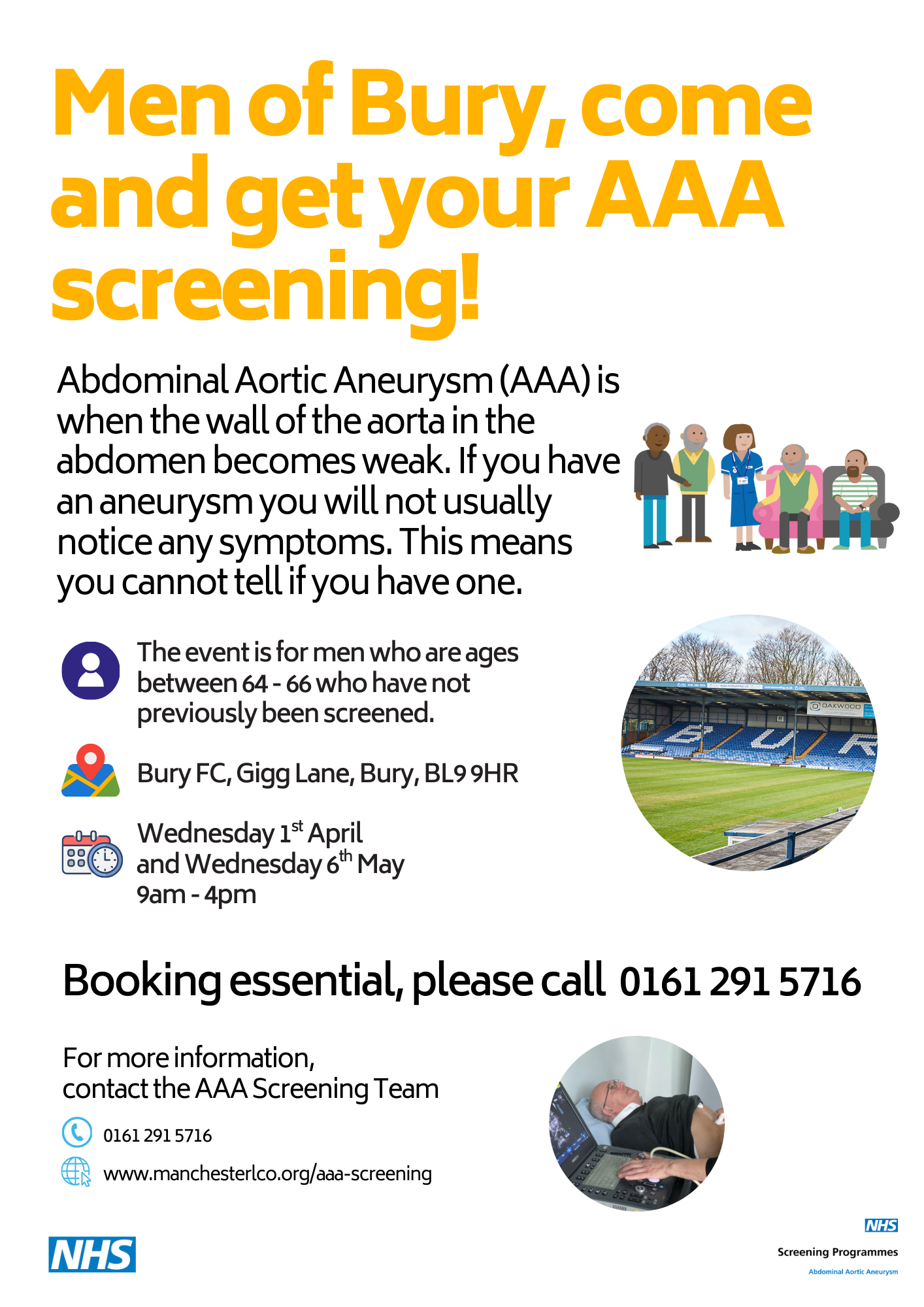 The AAA (Abdominal Aortic Aneurysm) Screening Team are holding two upcoming local screening events for eligible patients at Gigg Lane in collaboration with Bury FC